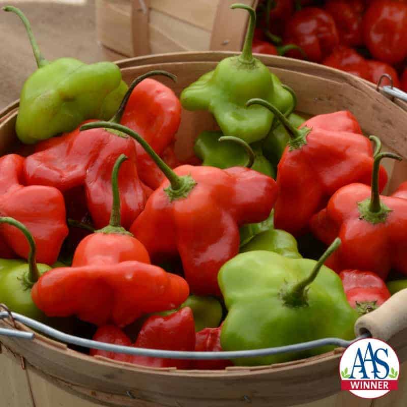 Intriguing small flattened-disc shape pepper with lobes or wings. Mad Hatter is crunchy, crisp and mild. Ideal for eating at mature green or ripe red stage. A large indeterminate plant that will benefit from a support or a trellis.