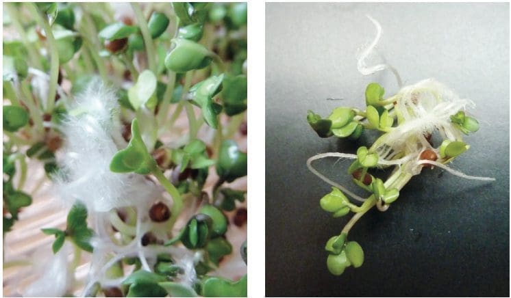 Attention à ne pas confondre les filaments de fines radicelles (radis, froment…) avec la moisissure qui dégage une odeur caractéristique !