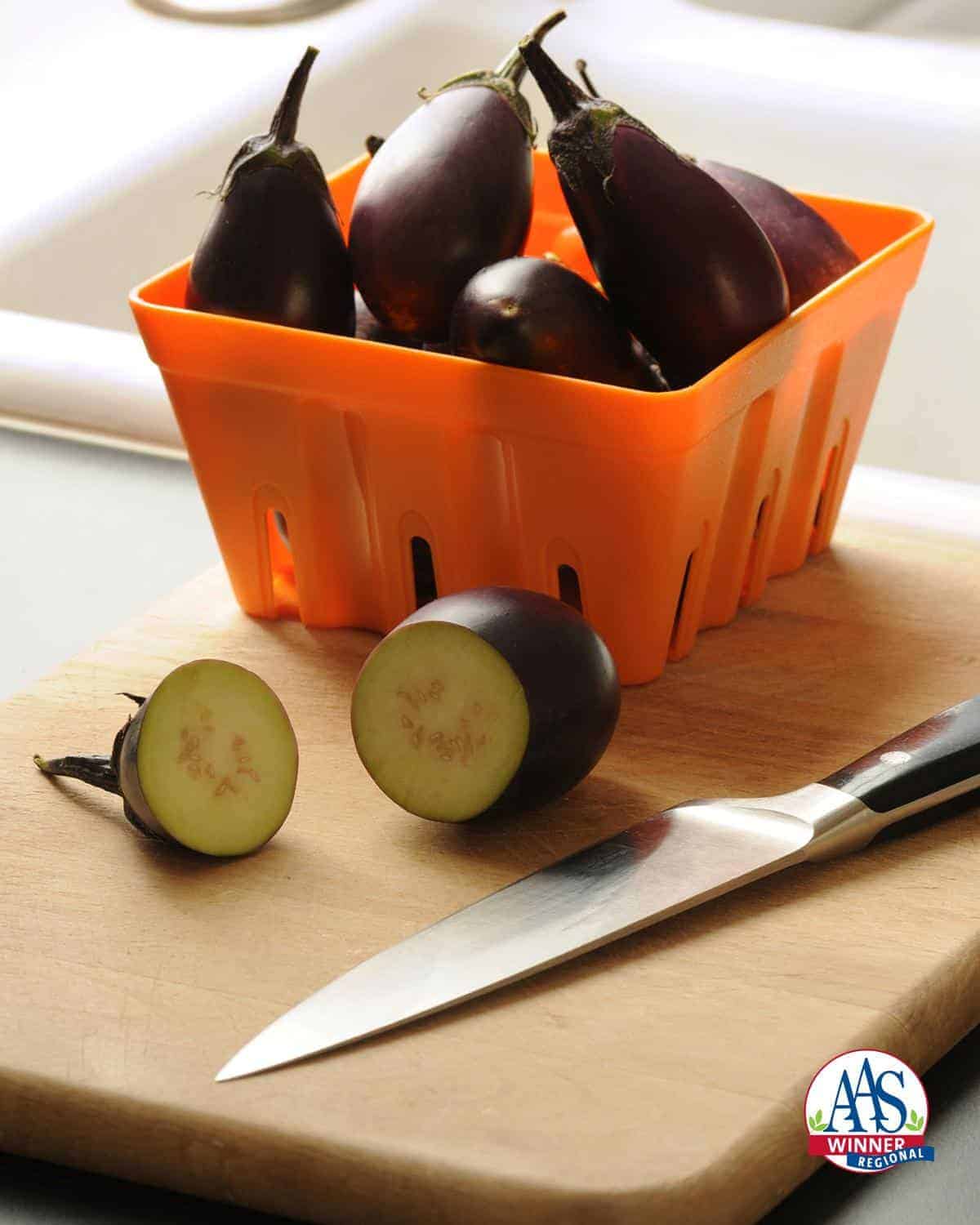 Variété unique d’aubergine au port compact, avec très peu d’épines, produisant des fruits miniatures, hâtifs, que les jardiniers peuvent récolter sur une longue période. Patio Baby se cultive tant en pot qu’en pleine terre.
